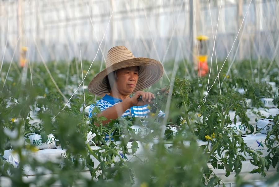 在江西省贛州市于都縣梓山鎮(zhèn)潭頭村的果蔬種植基地,村民給絲瓜整枝(2025年1月3日攝)。